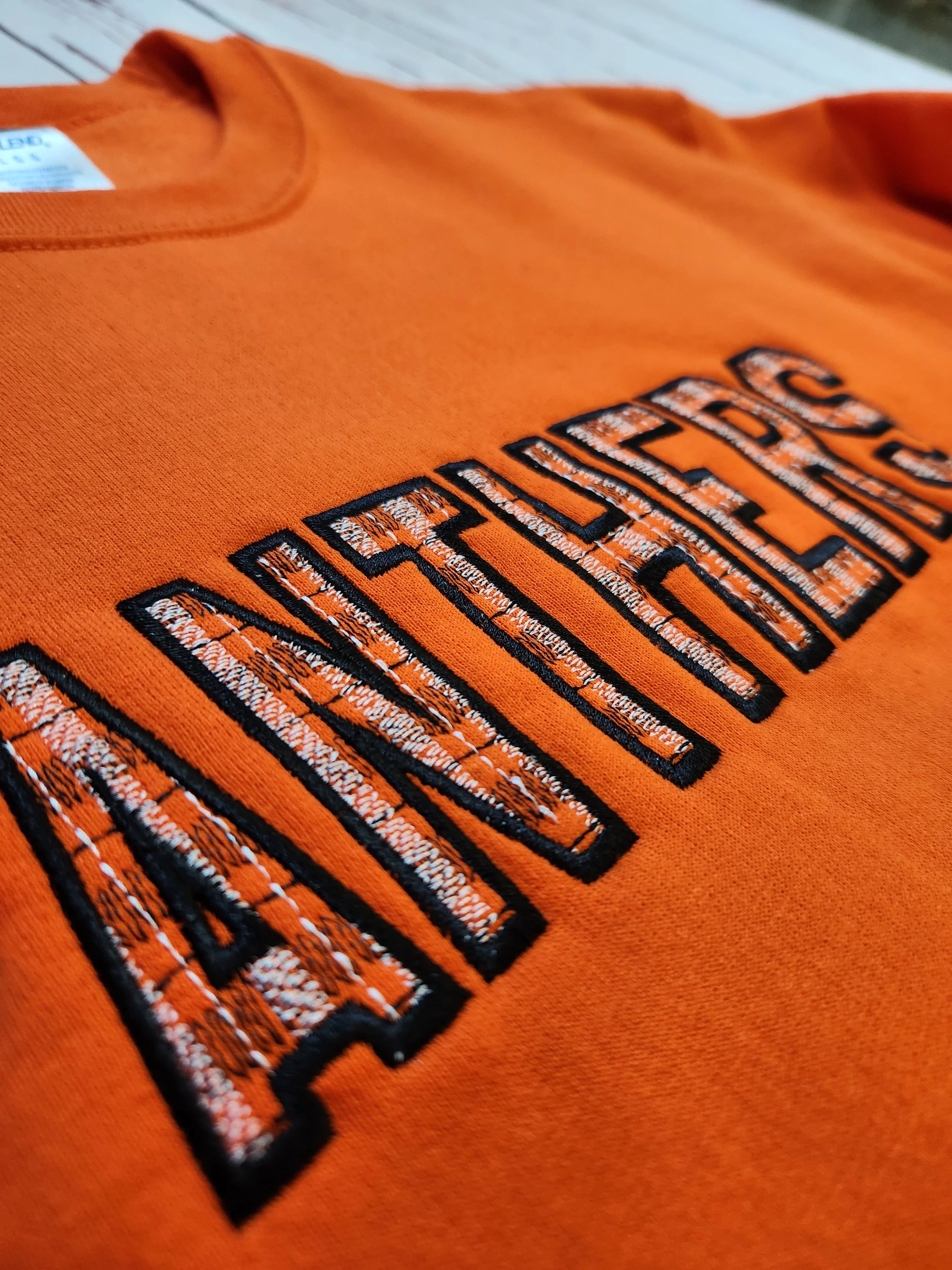 This Orange crewneck is crafted from a soft, durable 50/50 cotton-poly blend, offering just the right balance of warmth and breathability for all-day wear. The bold plaid print design is embroidered in bold black thread with white accenting, adding a pop of color and texture that gives this classic piece a fresh, sporty edge.